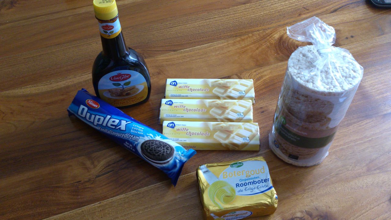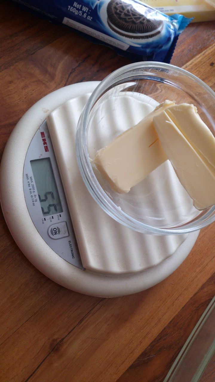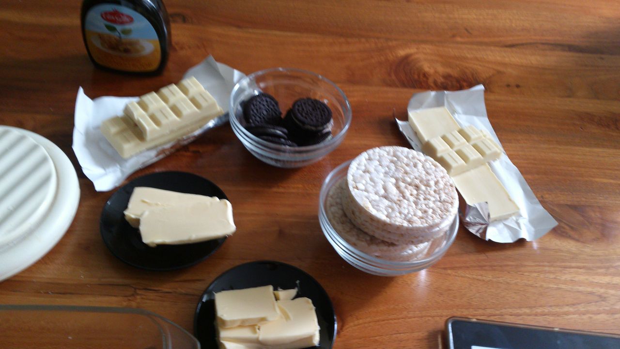 wij hebben alles alvast klaar gezet, boter voor 2x afgewogen en ook zo met de chocola oreo's en de rijstwafels.