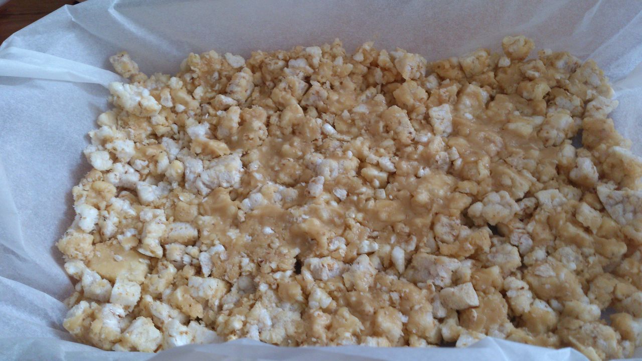doe wat in een bakschaal (?) met bakpapier er in en druk het goed aan, zet hem dan voor een tijdje in de koelkast.