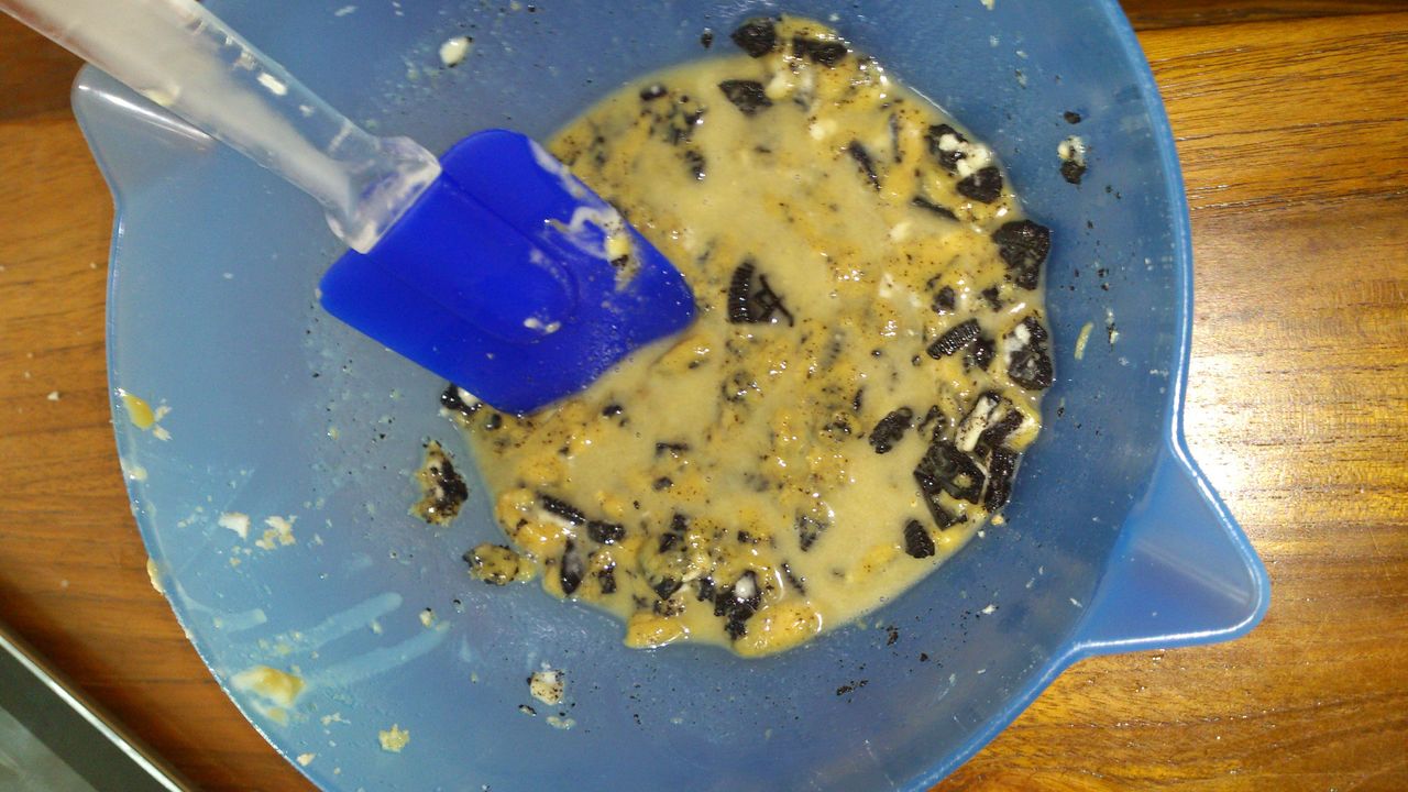 hak ook de oreo's fijn en doe het mengsel erbij, haa; laag 1 uit de koelkast en doe laag 2 erop, nogmaals goed aandrukken.